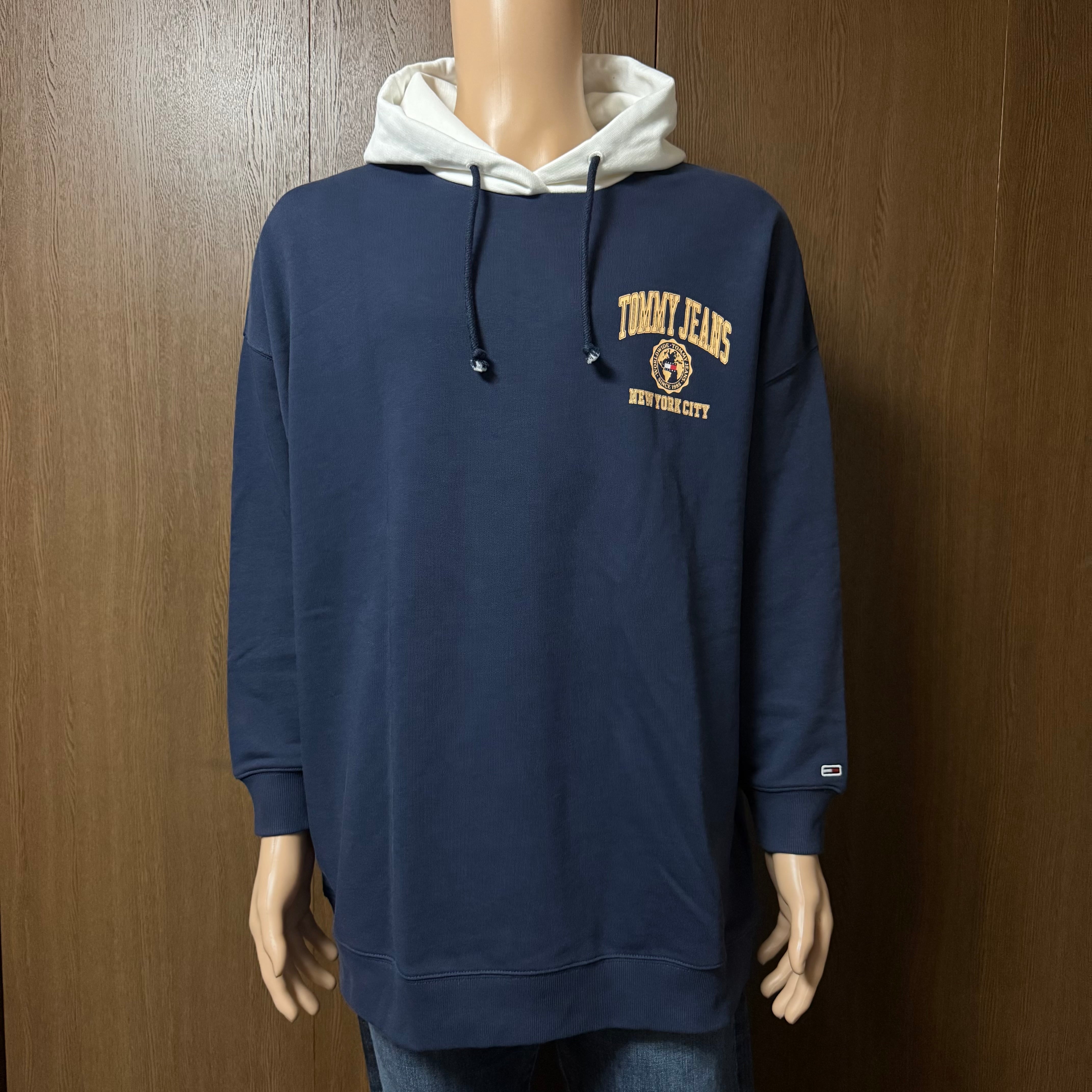 TOMMY JEANS トミージーンズ パーカー フーディ 両面プリント カレッジプリント ロゴ オーバーサイズ ビッグシルエット バイカラー
