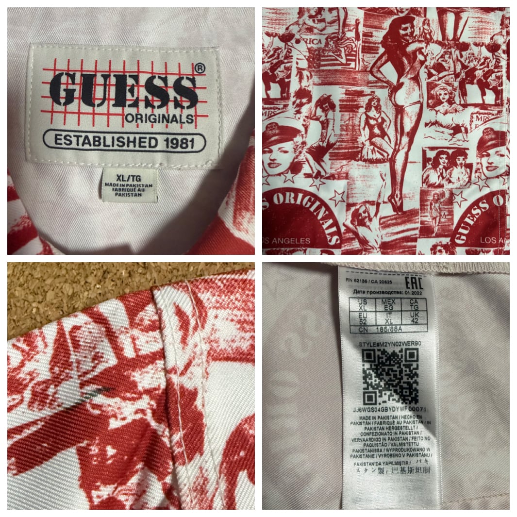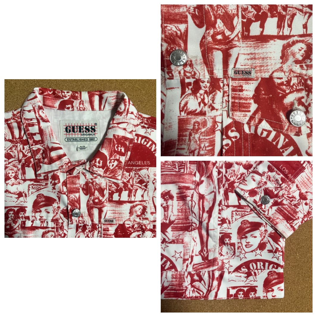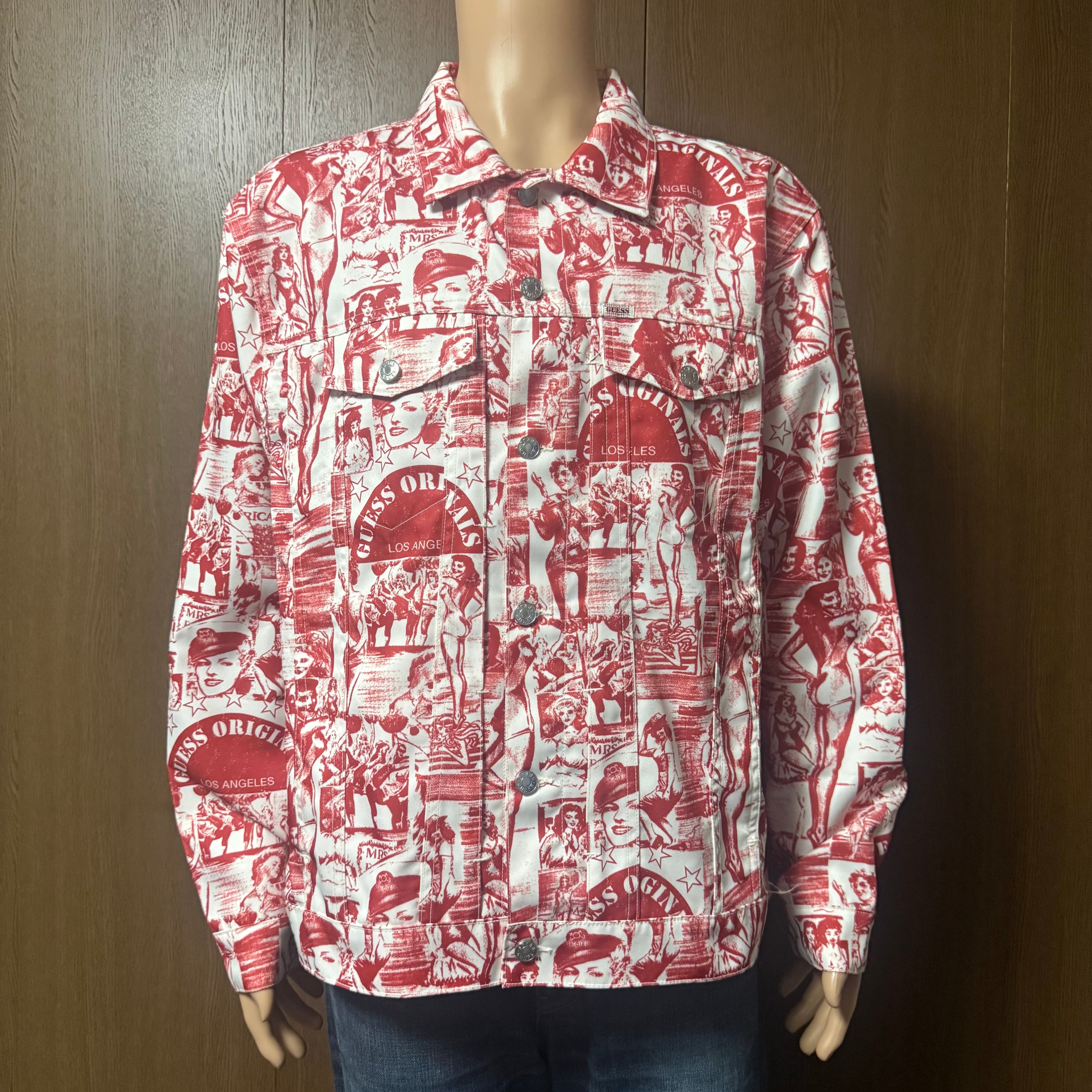 GUESS ゲス 総柄 デニムジャケット ブルゾン ポリエステル生地 イラスト プリント 汚れあり ストリート