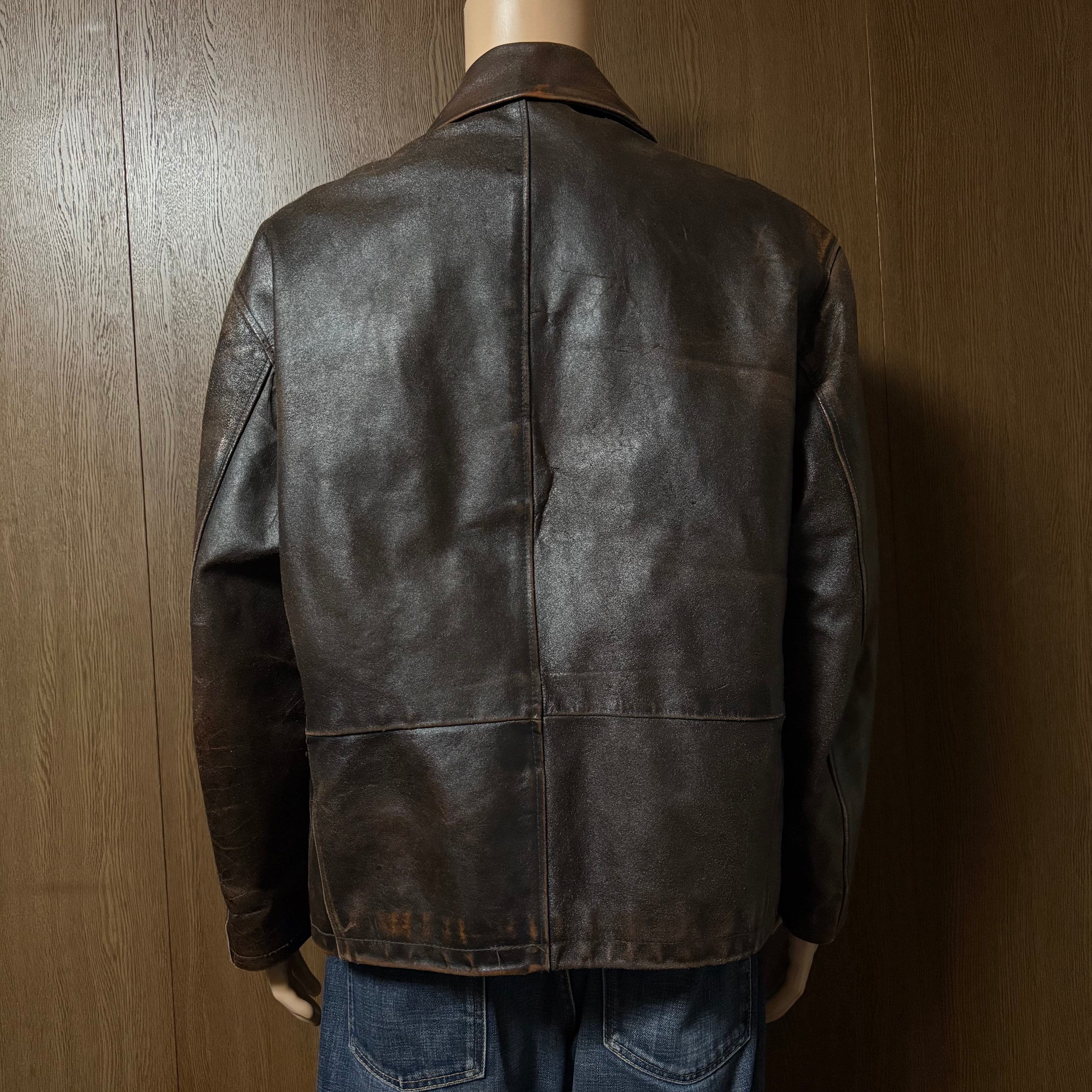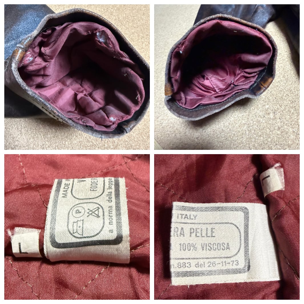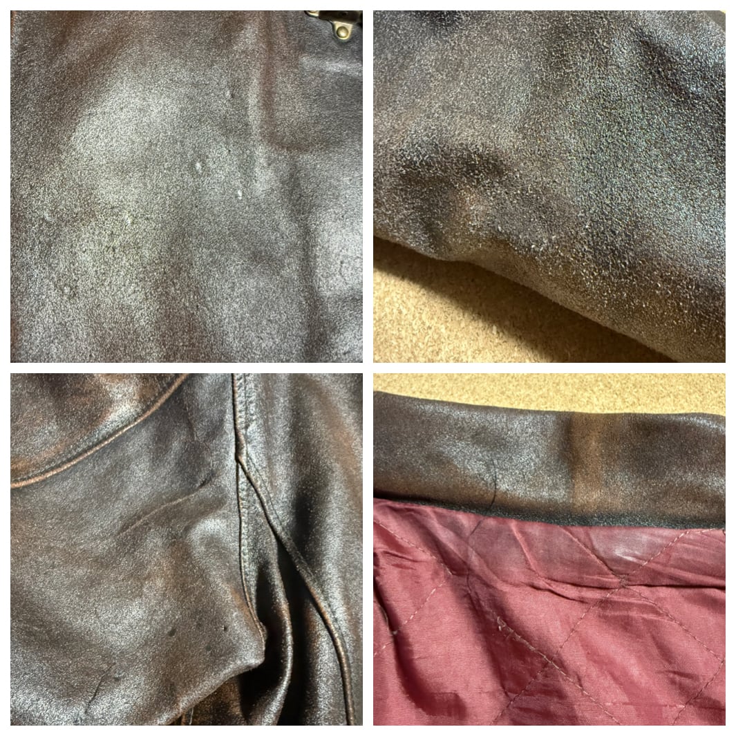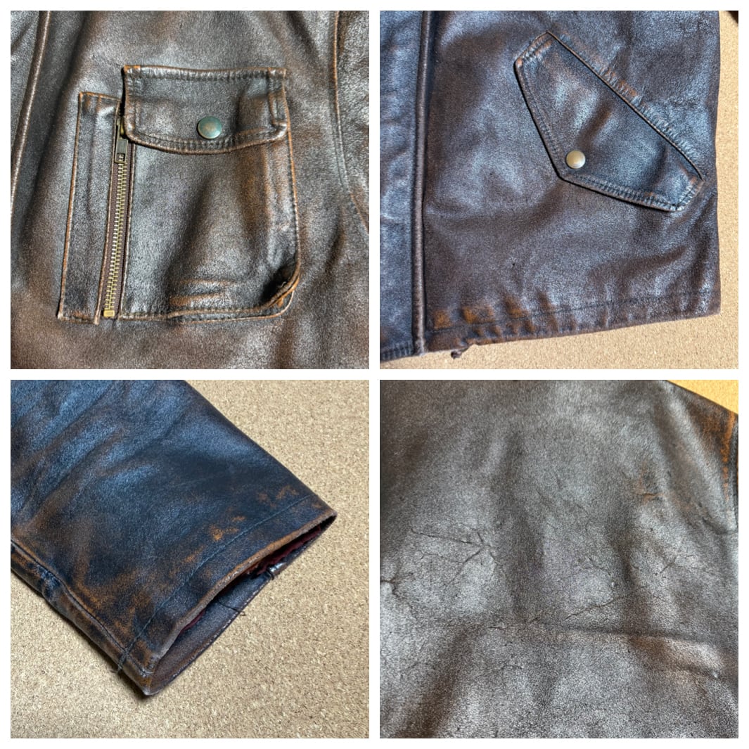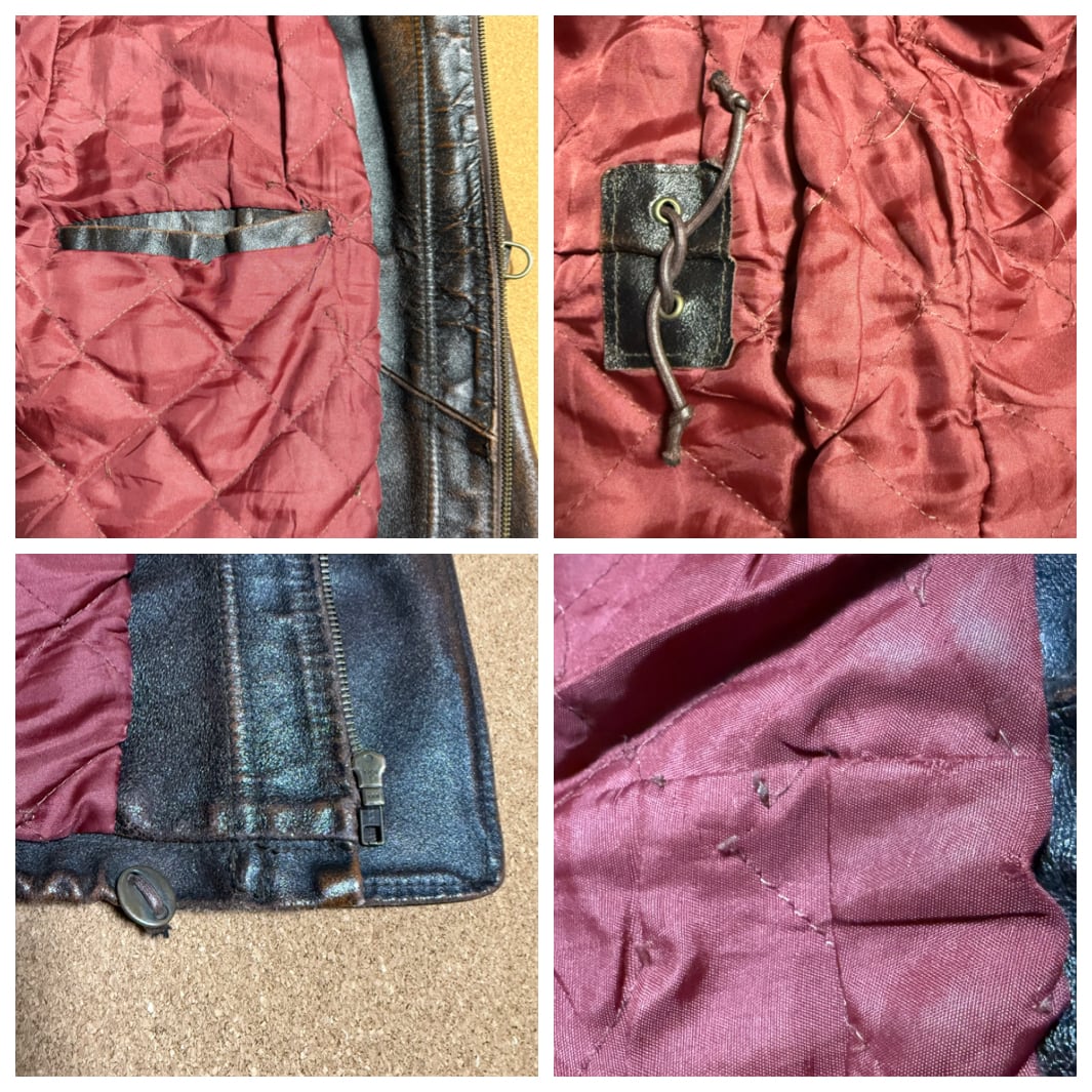 ※革のザラ付きや焦げ跡のようなもの、金属部分のサビ、裾や袖口にスレもあります。裏地はキルティング糸の切れや、擦り切れている箇所も複数あります。