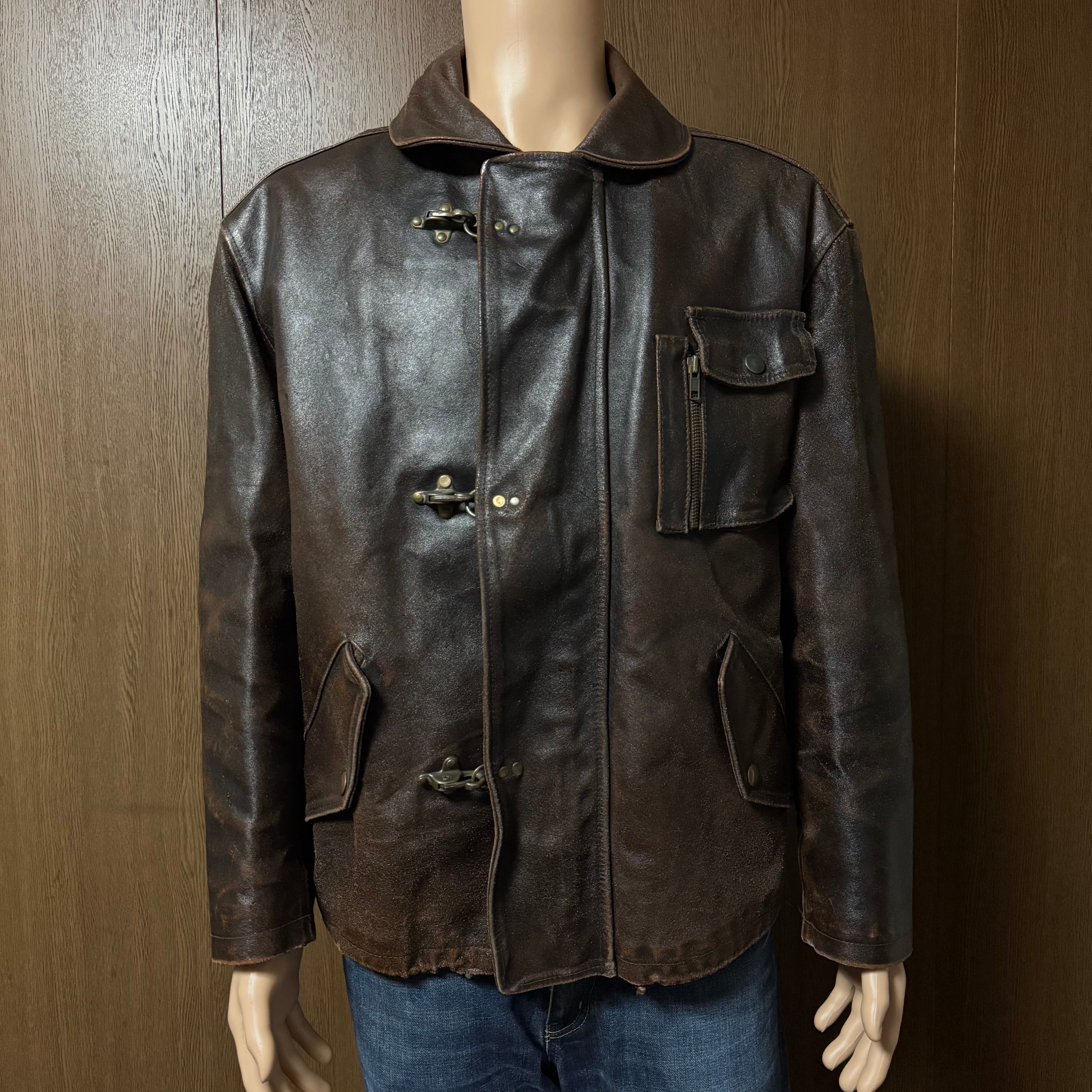 VERA PELLE ベラペレ ヴェラペレ レザー リアルレザー 本革 ファイヤーマン ジャケット ブルゾン 金具 フック 内ポケット ダメージあり 焼けた痕 シワあり 裏地強ダメージ キルティング ドローコード ワーク