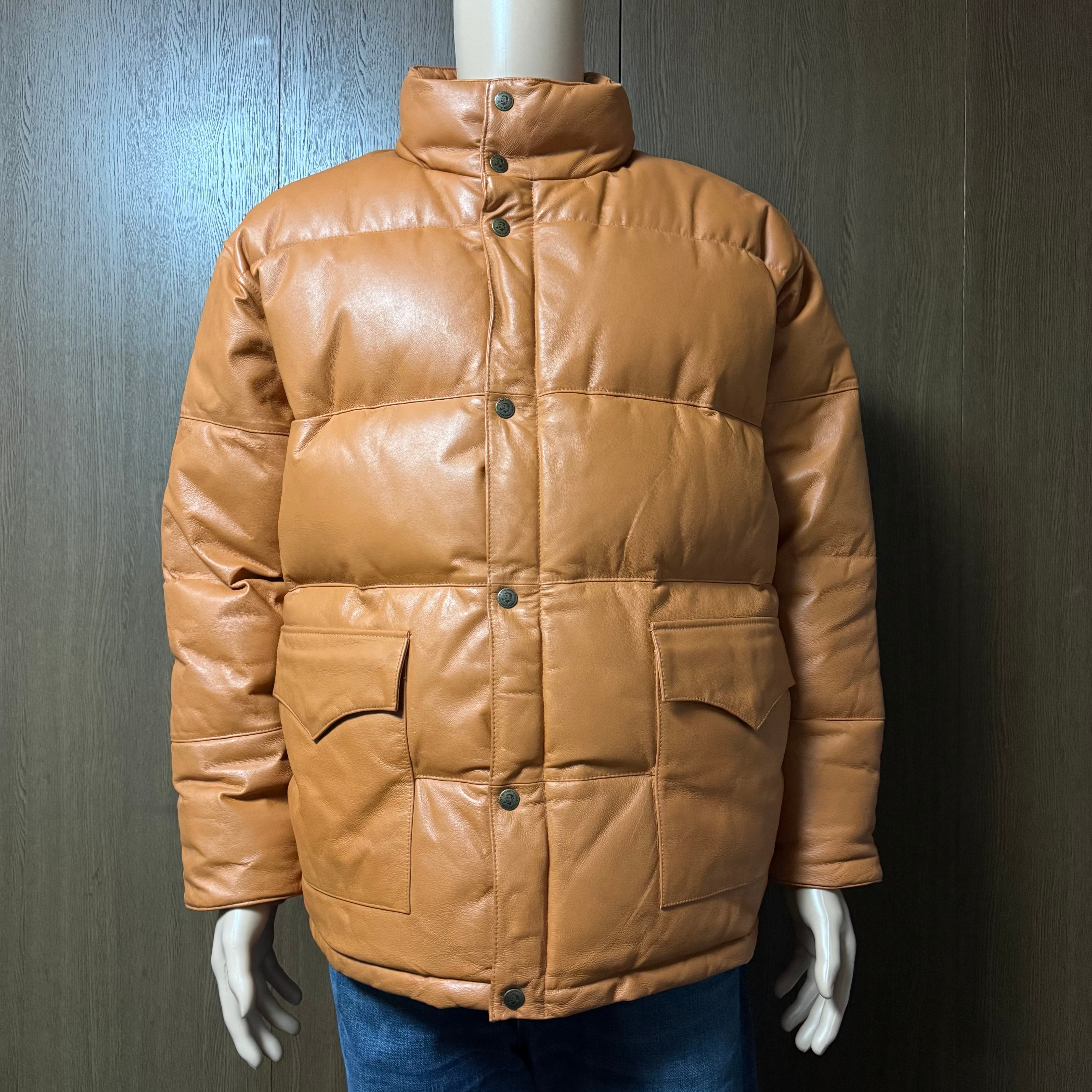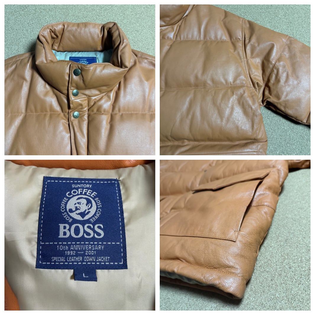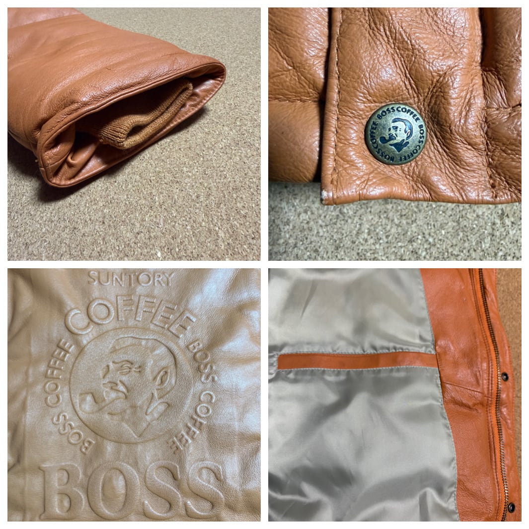 SUNTORY BOSS COFFEE サントリー ボス コーヒー レザー 本革 リアルレザー ダウンジャケット 背面エンボスロゴ リブ 内ポケット 虫食い穴あり ダメージあり